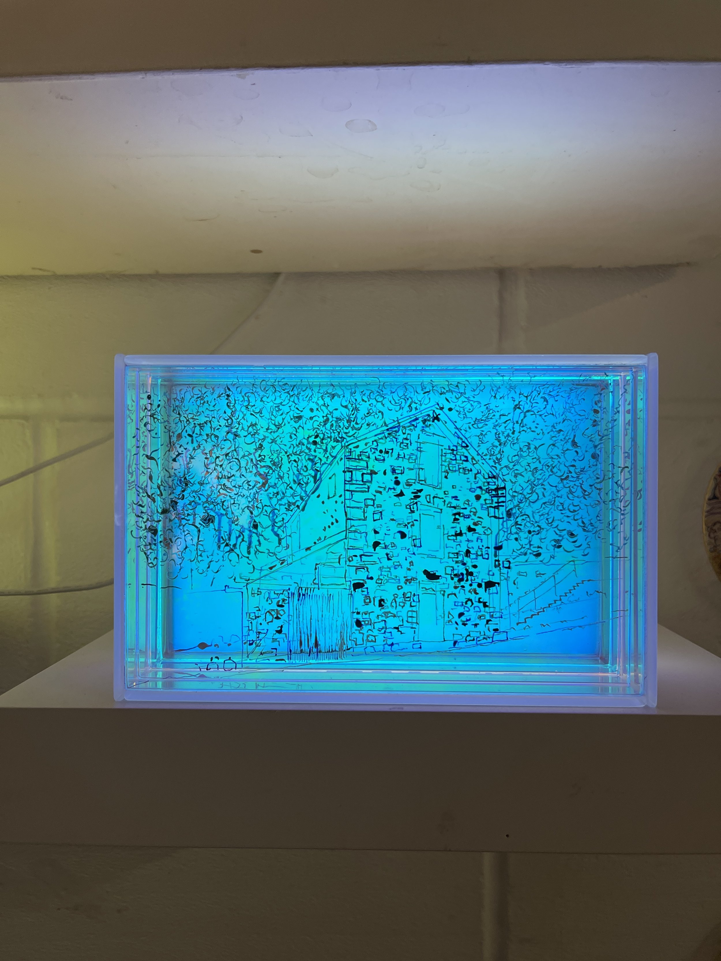 This recent bespoke glass light commission was created for a private collector who had recently acquired an historic building on the Isle of Skye, Hebrides, Scotland. Using a photograph of the building as the starting point, the piece translates architectural detail, atmosphere, and sense of place into a one-of-a-kind contemporary glass light.